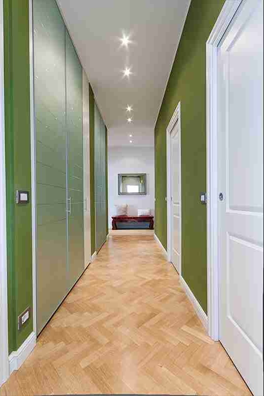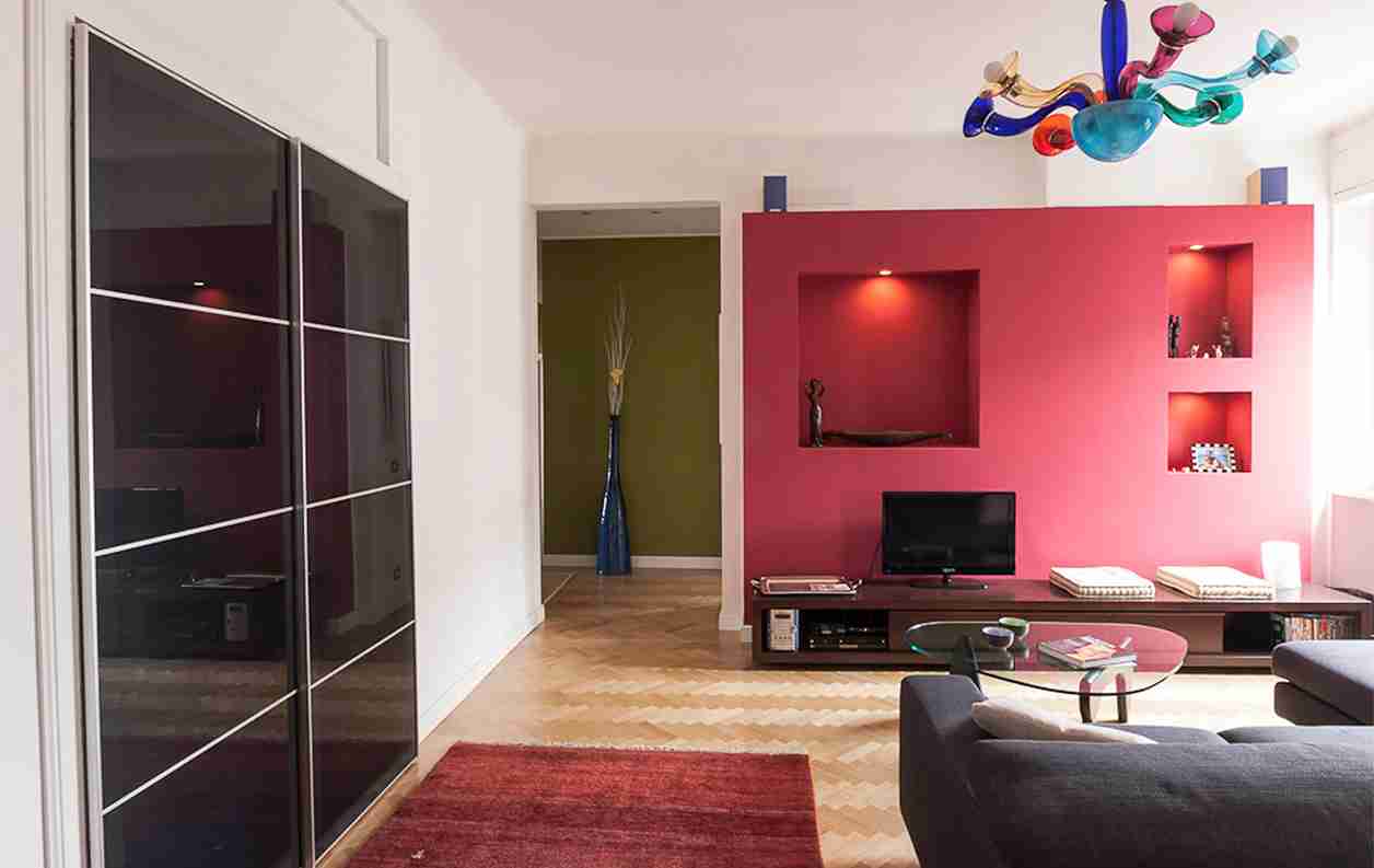 In un edificio degli anni cinquanta, il focus della ristrutturazione di questo appartamento di circa 140 mq è stato il colore: esso è il filo conduttore per valorizzare oggetti, sculture e arredi provenienti da tutti i continenti, ricordi di una famiglia di viaggiatori. Il lungo corridoio è stato valorizzato con pareti attrezzate disegnate su misura in vetro sabbiato: la prospettiva si chiude con l’ampia cucina dalle pareti rivestite in pietra.